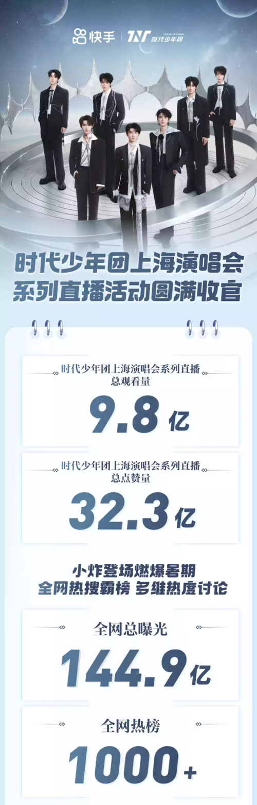 這個夏天,快手平臺上再次記錄了爆米花與時代少年團雙向奔赴的美好瞬間。在時代少年團上海演唱會舉辦期間,快手在這個夏季特別推出三場獨家直播,從多機位高清直擊現場盛況到演唱會幕后故事大放送,打造了一場貫穿臺前幕后的沉浸式視聽盛宴。據悉,三場直播總觀看量達9.8億,直播總點贊量達32.3億,時代少年團的獨家精彩,只在快手。
